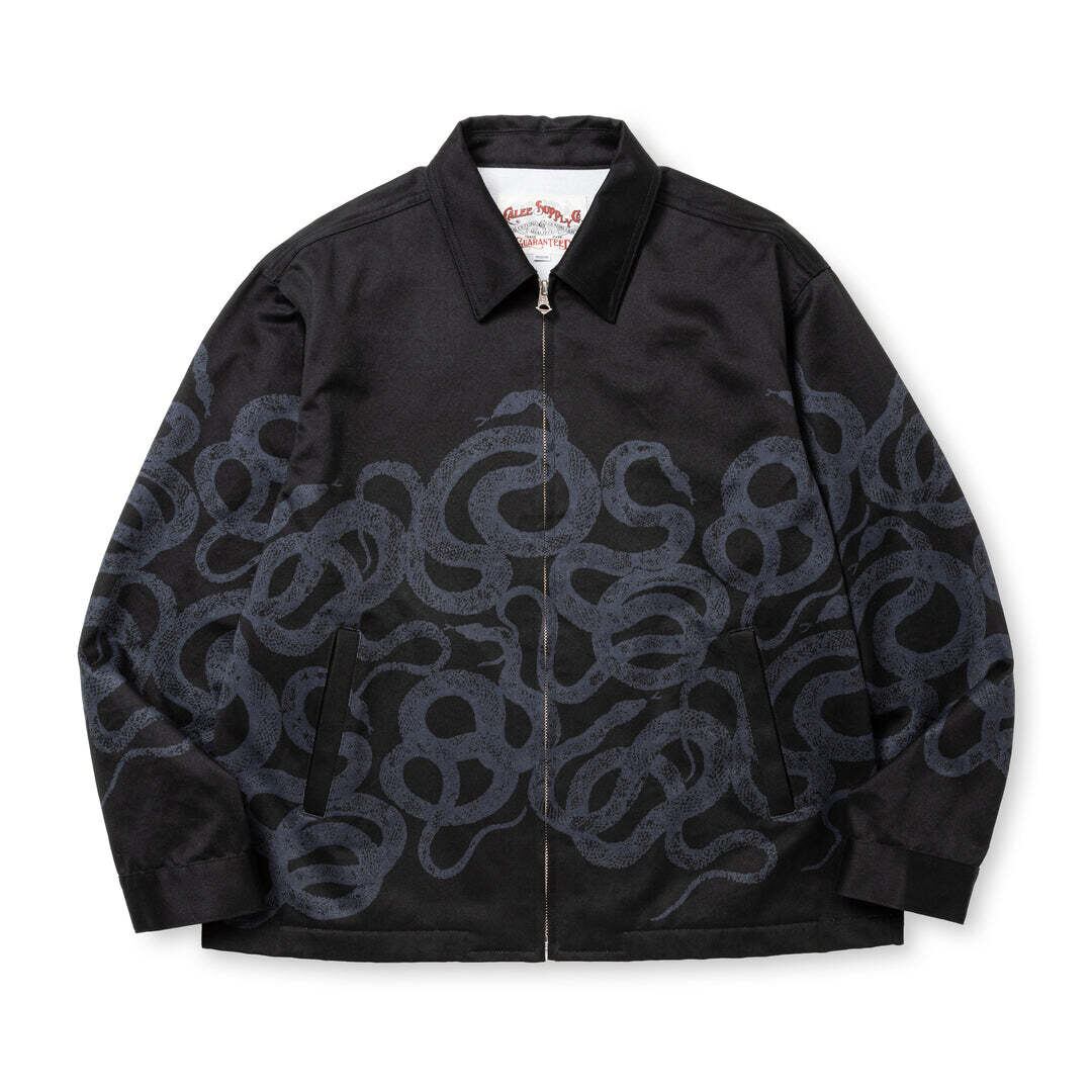 スネークパターンスウィングトップ。身頃、背面、袖それぞれのパーツにスネークパターンプリントを配置したスウィングトップ。ウエポン生地にオリジナルスネークパターンを余白が残る様にプリントし、裁断、縫製を行っている。身幅にゆとりを持たせたショート丈シルエット。