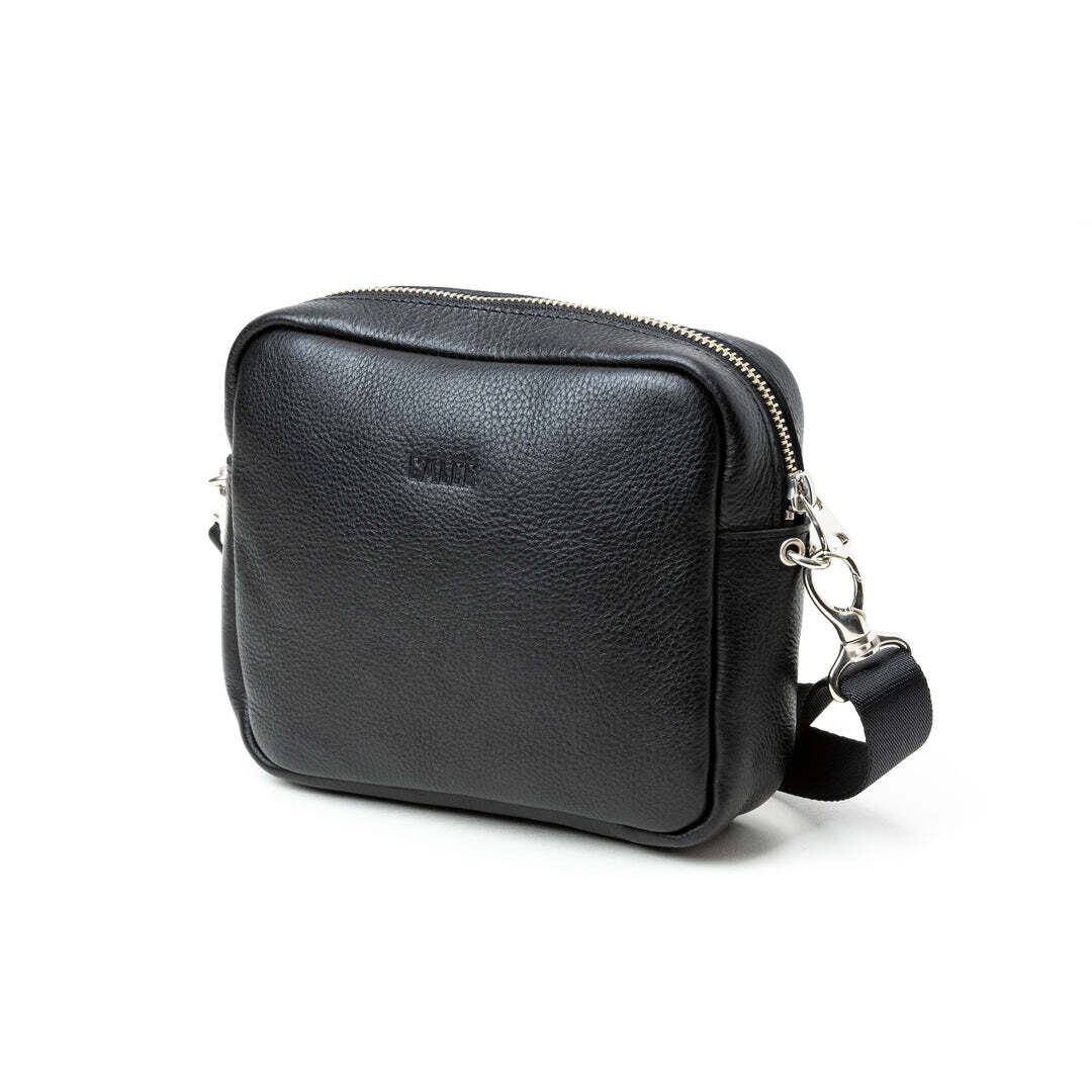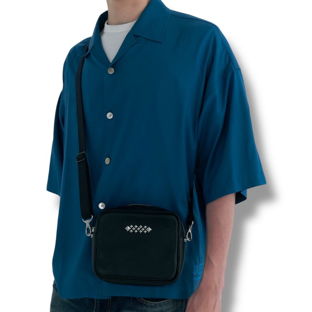 シボ感あるレザーで作製されたボックス型ショルダーバッグ。シボが特徴のレザーで使い込む程に、シボ感が消え、光沢感が出てくる経年変化。ピラミッド型スタッズを施したデザインワーク。
