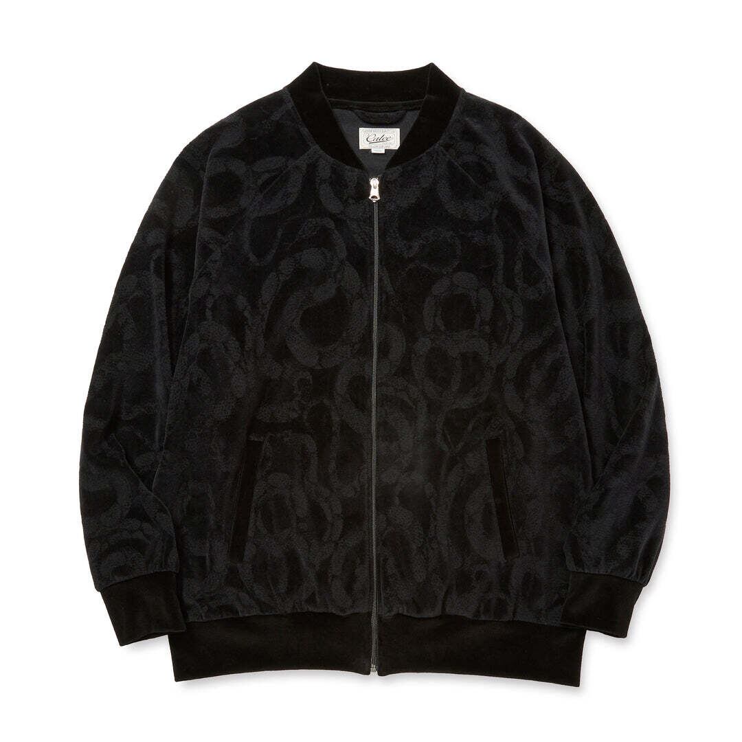 ジャガード総柄ベロアリブジャケット。定番のスネーク柄をジャガード織りにて表現した肉厚なベロア生地を採用。生地の工程全て国内工場で行っている。襟、袖口、裾、ポケット口は無地ベロアで切り替え。