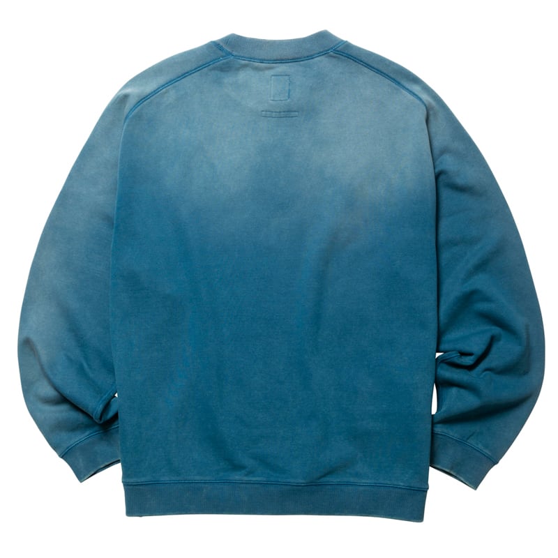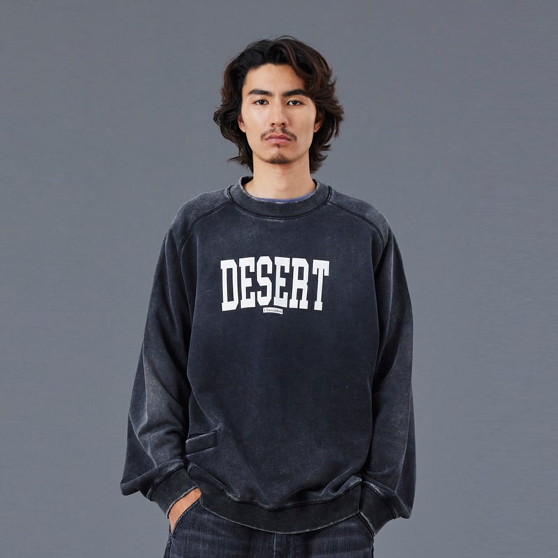 度詰めの裏毛スウェット生地にビンテージウォッシュ加工を施したプリントクルーネックスウェッ