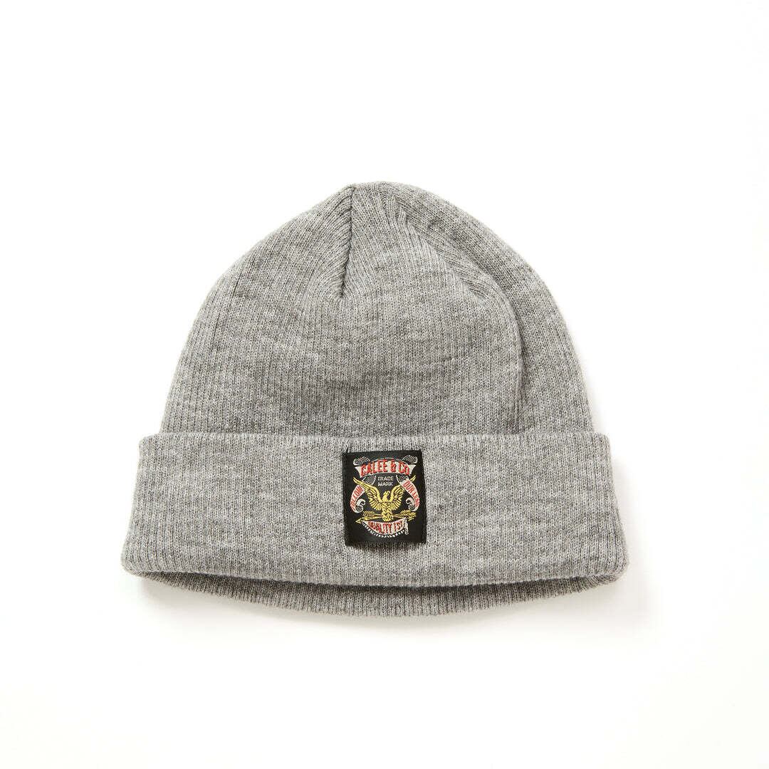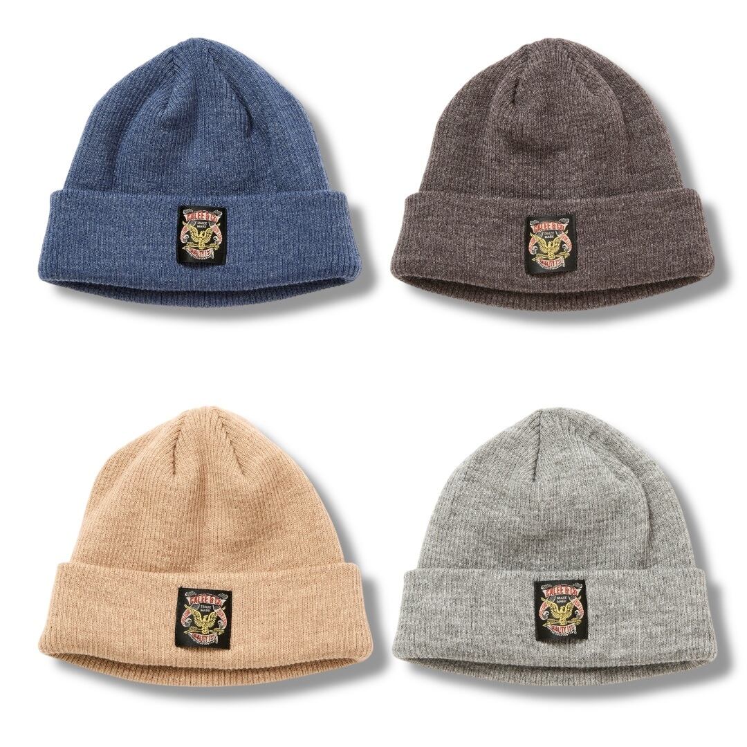 折り返し杢ニットCAP。アクリルとウールの混紡の杢糸で編み上げ、折り返しにネームが付く。