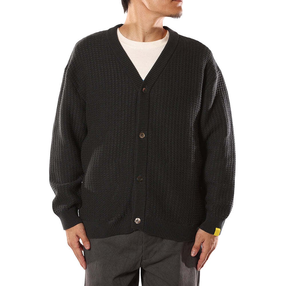 EYYAワッフルカーディガン。全ての工程を日本で行う、JAPAN KNITブランドEYYAとのコラボ商品。オリジナルでビッグワッフル柄を製作。