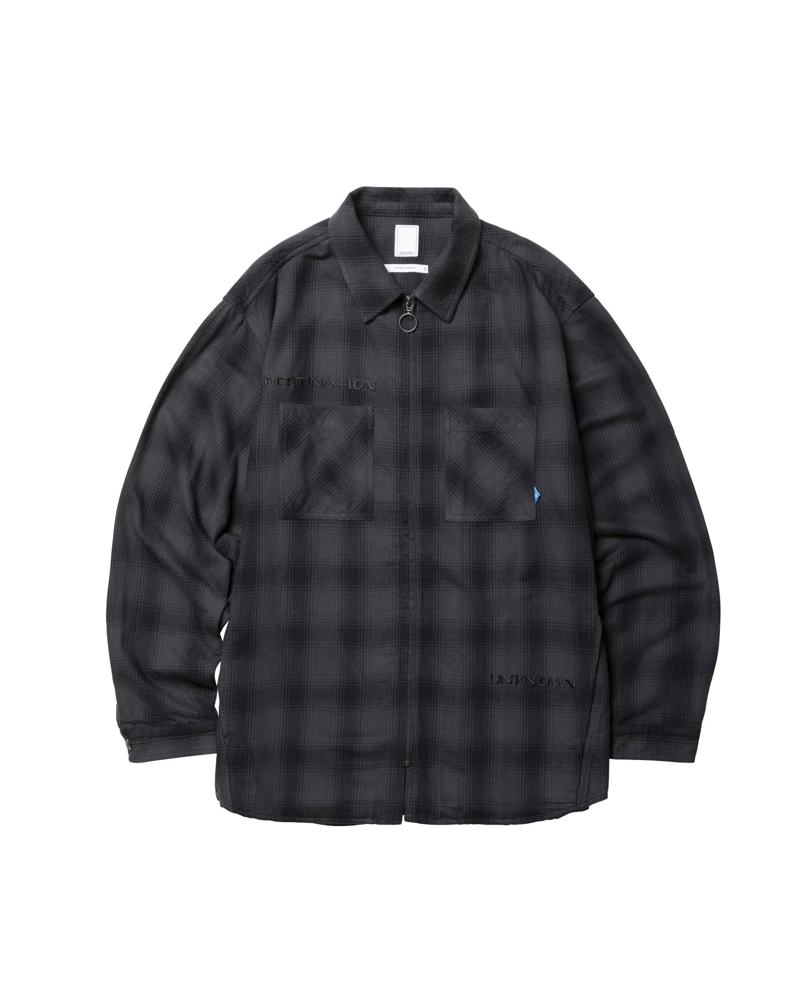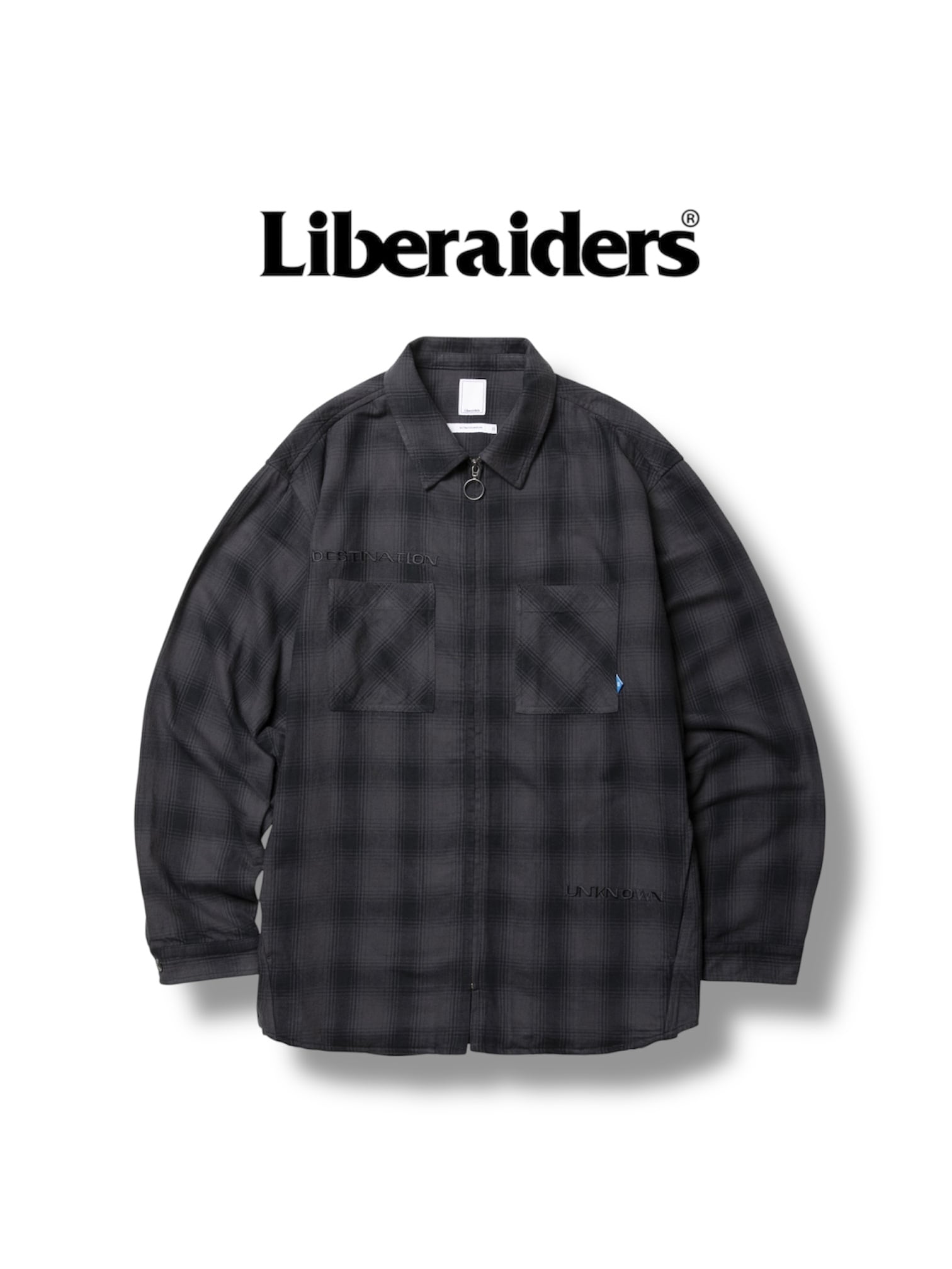 右胸、左裾にはDESTINATION UNKNOWNのロゴが同色で刺繍されています。背面ヨークにはLIBERAIDERSの同色刺繍が入ります。