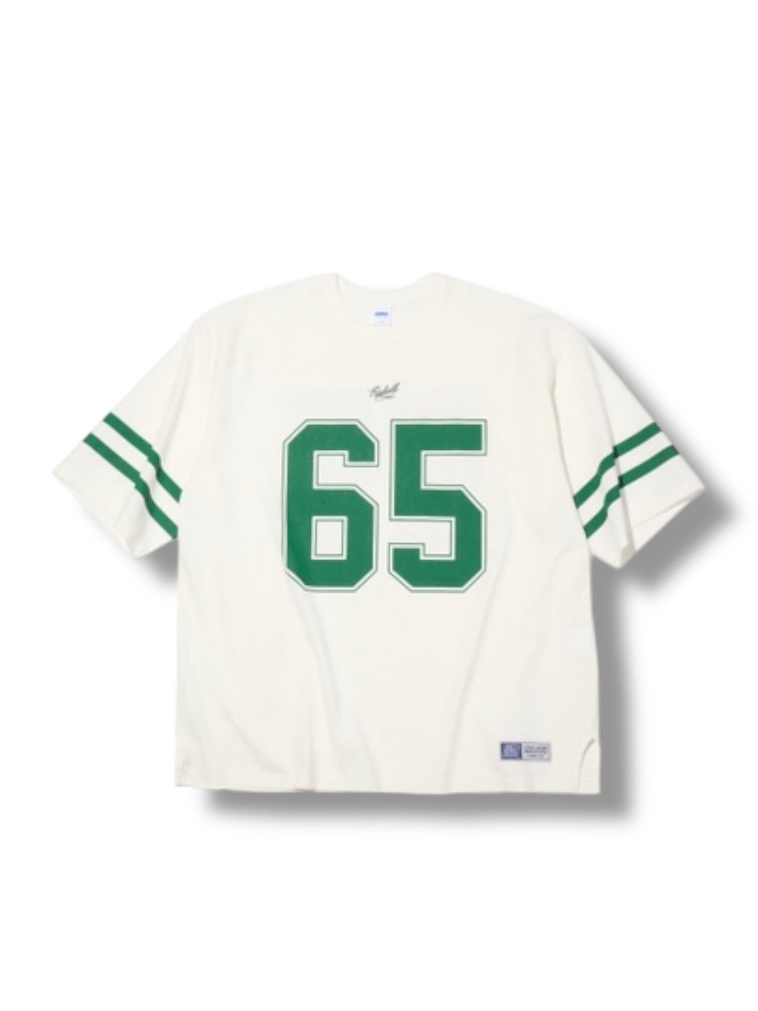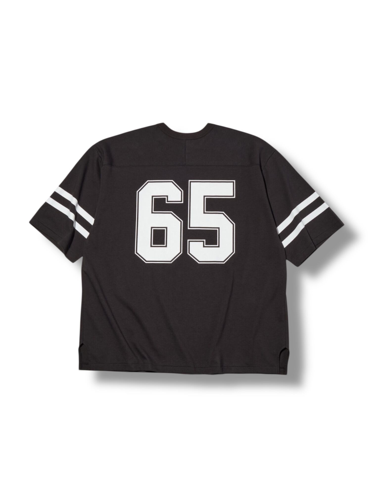 袖にライン、胸にはナンバリング “65” のラバープリント、フロントヨーク下にはブランドロゴが刺繍で入る。
